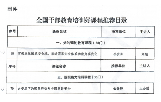 近日,中共中央组织部办公厅印发《关于全国干部教育培训好课程推荐目录的通知》,我院马克思主义教研部王会鹏副教授研发的《大变局下的国际形势与中国周边安全》课程入选“全国干部教育培训好课程”,这是近年我院培训课程建设取得的又一新突破。此次评选,全国共有183门课程入选,公安系统两门课程入选。近年来,王会鹏副教授先后研发了《深学细悟习近平新时代中国特色社会主义思想》《大变局下的国际形势与中国周边安全》《“一带一路”铁路发展与安全保障合作》《中欧班列突出安全风险与挑战》等课程,为学校师生和在职民警授课30余场次。