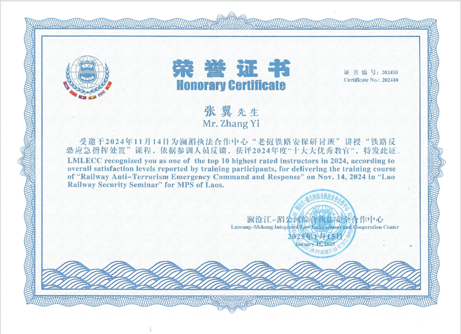 近期,澜沧江—湄公河综合执法安全合作中心公布了评选的2024年度“十大优秀教官”,我院外聘实战教官、郑州铁路公安局郑州公安处情指中心主任、郑州站派出所负责人张翼同志受邀为“2024年老挝铁路安保研讨班”讲授“铁路反恐应急指挥处置课程”,成功获得该荣誉。张翼同志先后受邀在我院多期民警和国际执法培训班承担《铁路公安机关机构设置、基本职能与运行机制》《接处警及常见警情处置》《铁路反恐应急指挥处置》《“情指行一体化”警务运行机制下的重大紧急警情及突发案事件警务指挥》等课程授课任务,授课效果突出,受到中外方学员高度赞誉。