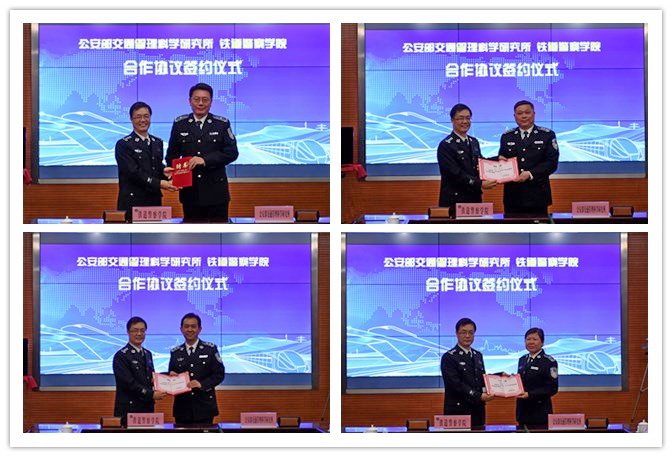 随后,管曙光院长和王长君所长分别代表铁道警察学院和公安部道路交通科学研究所签订了校所合作协议。依照协议约定,管曙光院长为首批指导我院科研人员的专家苑雷研究员、姜良维研究员、龚标研究员、许卉莹研究员颁发了铁道警察学院兼职教授证书。