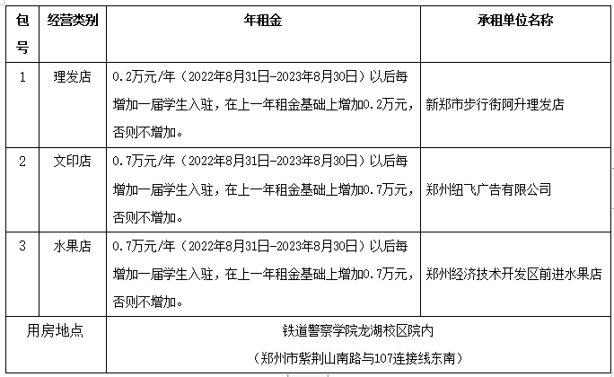 1、招租名称:铁道警察学院龙湖校区理发店、文印店、水果店等服务承租项目
