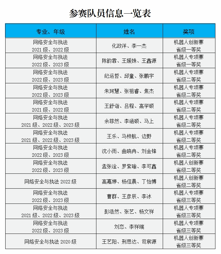 接到组委会备赛通知后,我院领导高度重视,积极组织全校师生广泛参与,最终选派图像与网络侦查系的李卫平、谷学汇、屠晓涵、王俊康四位老师担任本次竞赛指导老师,学管队为学生比赛的顺利进行提供支持与保障。经过层层筛选,最终确定了由化政洋、高嘉婷等43名学生组成的16支队伍,代表学院参加机器人创新赛、搬运机器人挑战赛等五条赛道的比赛。