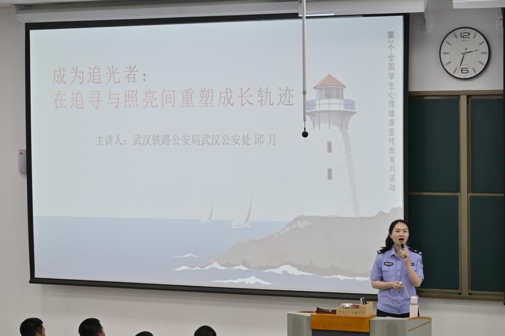 专业心理健康讲座。5月21日,学校特邀武汉铁路公安局邱月警官为我校2023级学生带来《成为追光者:在追寻与照亮间重塑成长轨迹》专题讲座。邱警官立足铁路公安职业发展需求,结合前期对我校学生调研收集的403份数据,围绕“职业素养培育”“积极心态塑造”“自我潜能激发”三大核心模块展开,结合铁路公安实战场景,深入浅出地剖析了铁路公安职业所需的核心素养,引导学生通过兴趣、能力、价值观的探索,激发内在动力,真正从“服从命令”走向“主动成长”的蜕变。讲座内容贴合学生实际,形式新颖,为学生的职业规划提供了清晰指引,赢得了师生的一致好评。