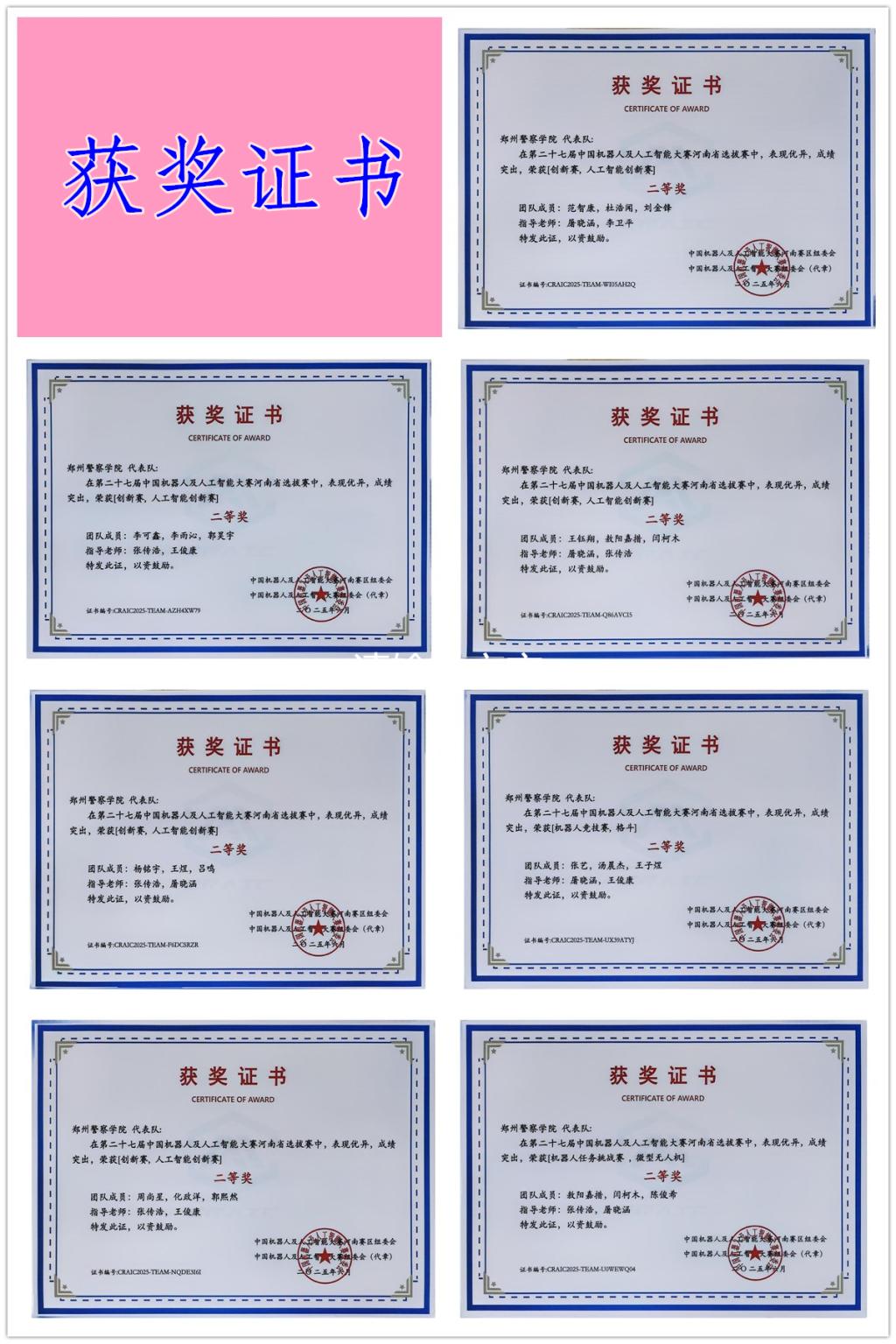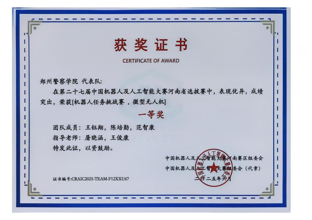 近日,第二十七届中国机器人及人工智能大赛河南赛区选拔赛在开封职业学院落下帷幕。由中国人工智能学会主办的中国机器人及人工智能大赛已列入中国高等教育学会发布的全国普通高等学校学科竞赛排行榜、全国普通高校大学生竞赛分析报告的名单。我校学子在本次赛事中表现优异,由王钰翔、陈培勋、范智康组成的“郑警雄鹰小队”,首次组队参加“微型无人机”赛道的比赛,经过努力拼搏,勇夺“微型无人机”项目一等奖。