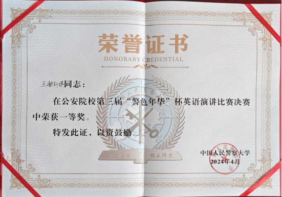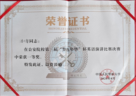 我院从校内层层选拔脱颖而出的22级同学潘可馨和王瀚轩祺,与来自其他8所公安院校的16位选手同台竞技。在气氛火热的赛场上,我院两位参赛同学演讲时激扬文字、妙语连珠,面对评委提问时沉着冷静、从容大方,充分展现出我院学子专业的英语素养、深刻的思想认识、清晰的逻辑思维以及谦逊的优良品质。经过2小时的激烈角逐,我院潘可馨和王瀚轩祺两位同学双双荣获一等奖!