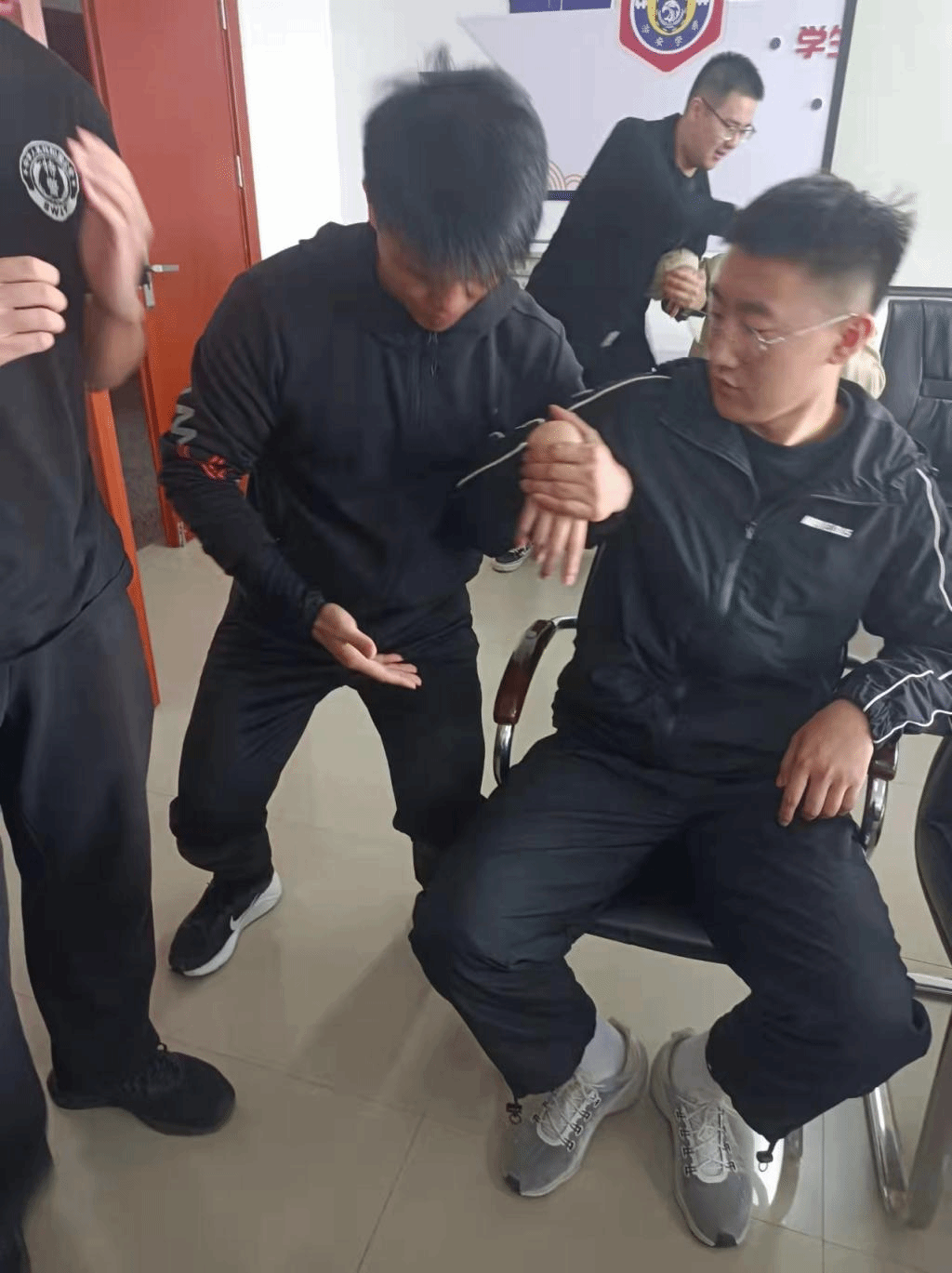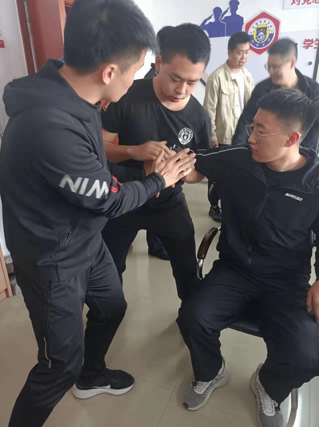 学生在实训中运用“压肘折腕”战术强制带离违法嫌疑人