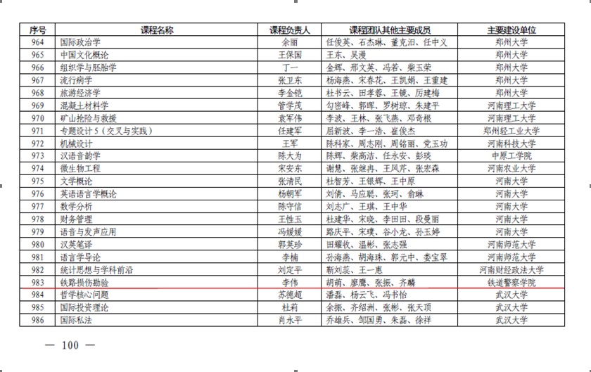 近日,河南省教育厅转发教育部《关于公布首批国家级一流本科课程认定结果的通知》,我院刑事科学技术系李伟教授主持的《铁路损伤勘验》课程入选国家级一流课程认定立项。该课程是面向我院刑事科学技术、侦查学、治安学等专业学生开设的一门专业基础和专业选修课。本课程依托法医学基本知识、基本理论和基本方法并结合铁路损伤勘验技能而开发的一门铁路特色课程,旨在培养学生具有铁路损伤勘验鉴识的基本知识和处置能力。多年来,在学院“政治建校、质量兴校、特色强校”办学思想指导下,在学院大力支持和铁路公安机关的帮助下,课程建设工作取得了优异成效,先后出版《法医学铁路损伤勘验》(共3个版次)、《法医学铁道损伤图谱》等多部教材专著。目前,该课程组由5名专任教师(教授2人、副教授2人、讲师1人)和2名实战教官组成,在全国公安院校中彰显出了较强实力和明显优势。