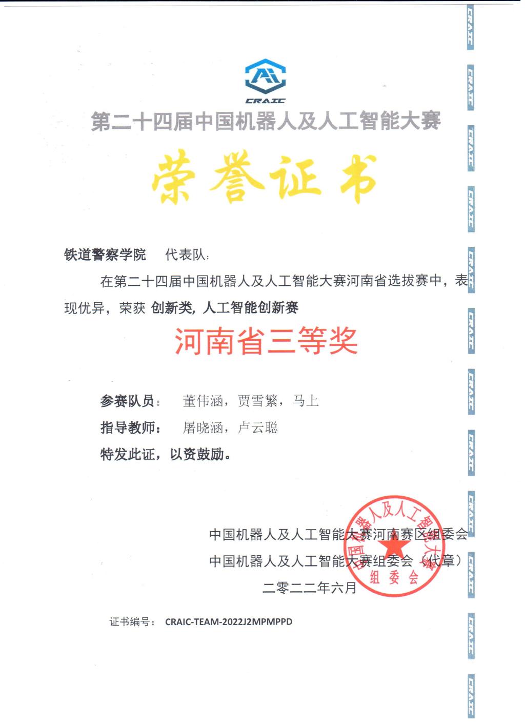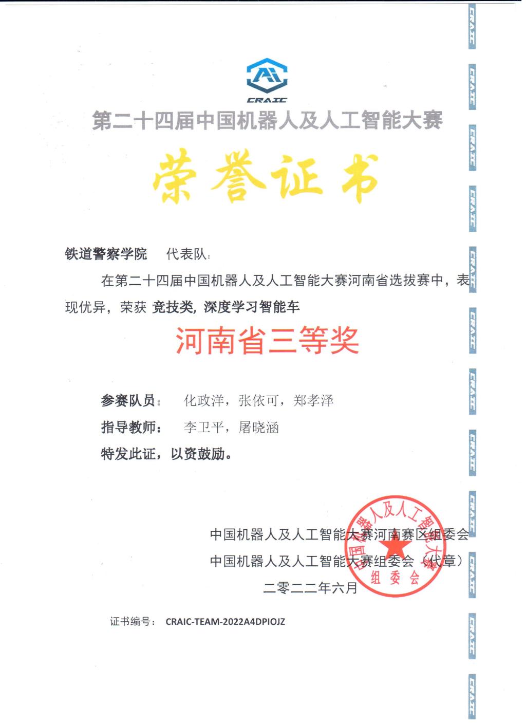 2022年5月22日,第24届中国机器人及人工智能大赛河南省赛在线上和线下同时开赛。本次省赛由中国机器人及人工智能大赛组委会和CAAI机器人文化艺术专业委员会联合主办。全省40余所高校,1785个团队参赛。我院图像与网络侦查系赵登科、甘笑然、周勋团队在深度学习智能车类竞赛中获得省级二等奖,将进入国赛;图像与网络侦查系化政洋、张依可、郑孝泽团队在深度学习智能车类竞赛中获得省级三等奖;图像与网络侦查系刘孟然、侦查学系劳兆盈团队在人工智能创新赛中获得省级二等奖,将进入国赛;公安管理学系董伟涵,图像与网络侦查系贾雪繁、马上团队在人工智能创新赛获得省级三等奖,指导老师团队成员为图像与网络侦查系李卫平、屠晓涵、卢云聪。