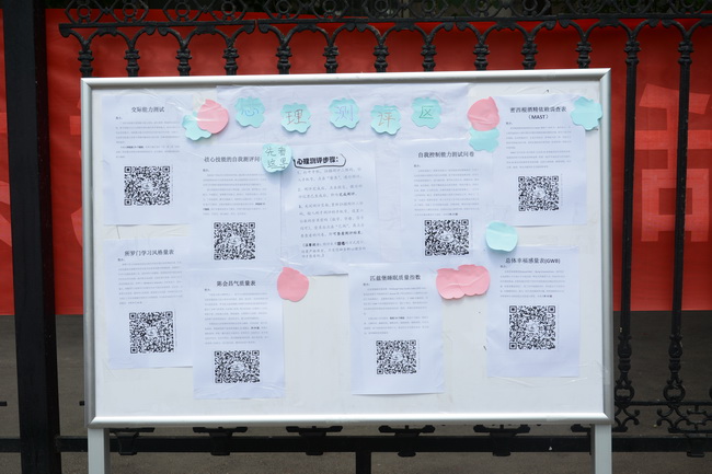 为帮助学生们更好的了解自我,5月13日至5月25日,设置了“心理测评区”,测评内容包括:交际能力、学习风格、气质类型、自我控制能力、核心技能评价、睡眠质量、酒精依赖状况、总体幸福感等方面。学生通过扫描问卷二维码,按照给出的操作步骤,即可完成在线测评,并可得到一份测评报告。不少学生对此心理测评很感兴趣,纷纷走上前去进行查看和扫码测试。