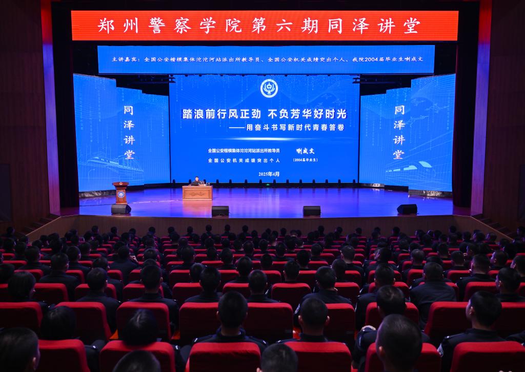 本期同泽讲堂,我院2004届毕业生喇成文以《踏浪前行风正劲不负芳华好时光——用奋斗书写新时代青春答卷》为题,深情回溯了自己从郑警学子蜕变为“天路卫士”的21年征程,分享了自己扎根高原的初心与感悟,为2023级、2024级学警们献上了一堂震撼心灵的忠诚教育课。