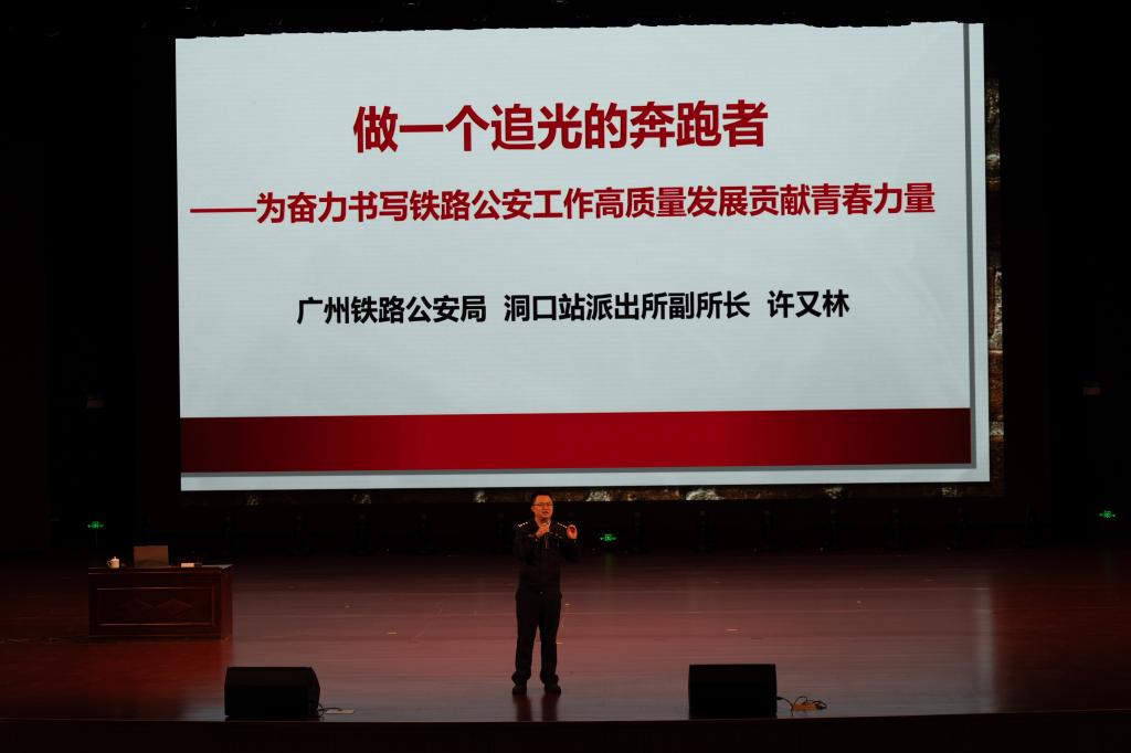为引导学生坚定理想信念,树立奋斗目标,加强专业学习,提升素质能力,11月27日,广州铁路公安局怀化公安处洞口站派出所副所长、第八批驻校实战教官许又林应学院邀请,做客学院第39期学风讲堂,以“做一个追光的奔跑者”为题,在龙湖校区礼堂为2024级全体学生作专题讲座,全体2024级学生参加。受学工部邀请,公安管理学系邓克涛老师主持讲座。