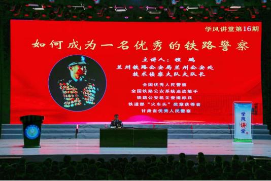 4月11日晚,兰州铁路公安局兰州公安处技术侦察大队大队长、“功勋民警”程鹏受邀做客我院第十六期“学风讲堂”,以“如何成为一名优秀的铁路警察”为题,在农业路校区礼堂为我院1000余名学生开展专题讲座。