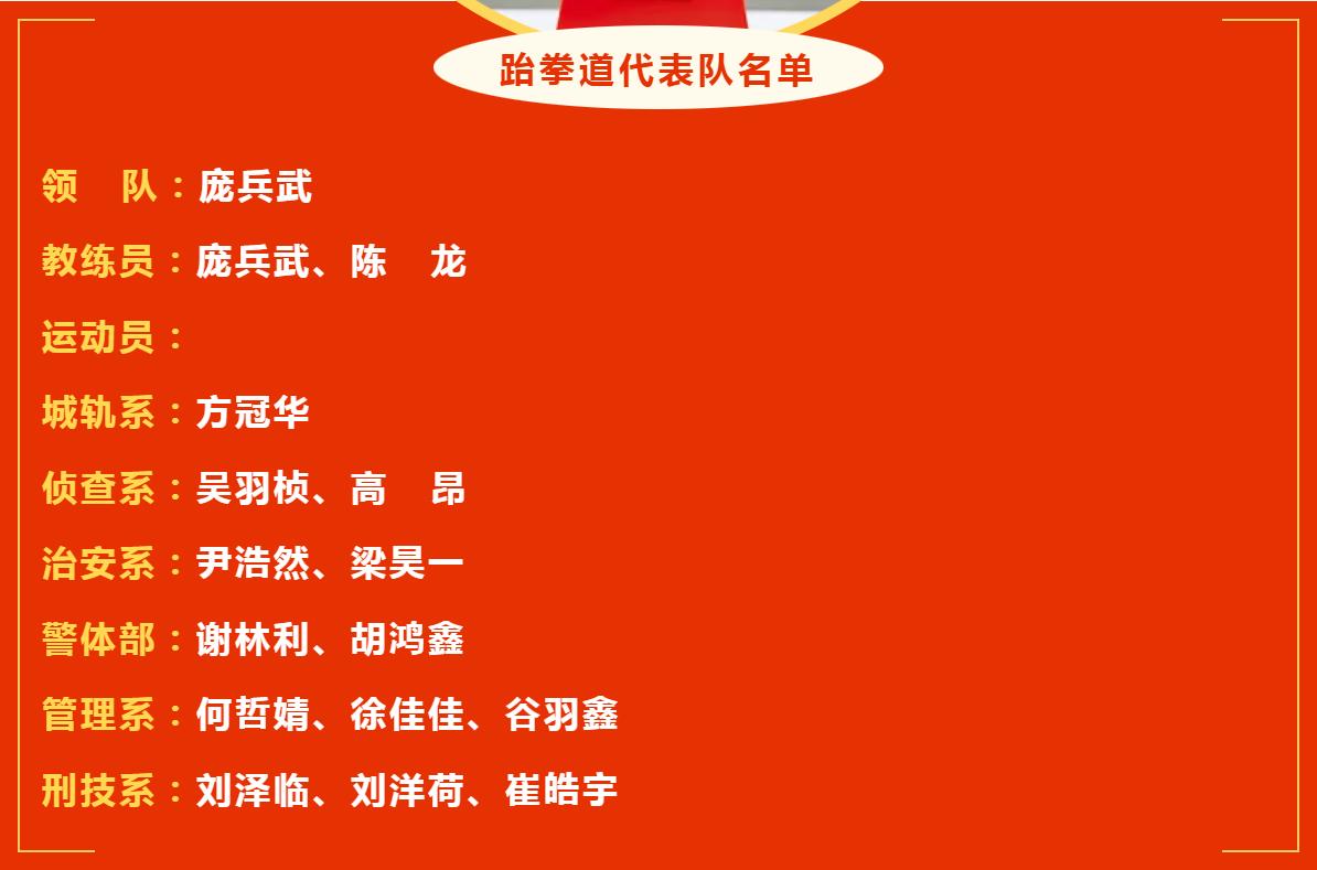我院跆拳道代表队由城市轨道交通安全保卫系方冠华等13名同学组成,经顽强拼搏,个人斩获11金、4银、7铜,荣登本科甲组竞技男子团体总分第一名宝座,学院喜获“跆拳道示范校”荣誉称号。本次比赛突破了我院跆拳道队单次参赛获奖数量,创历史新高。