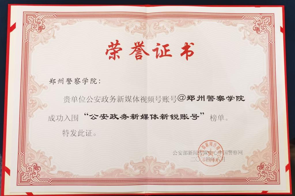 “郑州警察学院”视频号凭借其出色的内容创作和广泛的社会影响力,成功入围“公安政务新媒体新锐账号”榜单,展现了学院在新媒体领域的卓越成就。