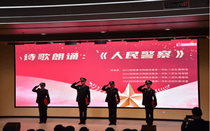 枪林弹雨里,有一种微笑叫无畏;铁血柔情中,有一种泪水叫隐忍;忘我付出时,有一种幸福叫坚守;熠熠警徽下,有一种荣耀叫奉献。2022级黄明浩、肖竣铭同学以及2023级的曾雄亮、陈洁莹同学带来了《人民警察》朗诵。人民警察,一身藏蓝筑青春,是捍卫政治安全,维护社会安定,保障人民安宁的“逆行者”,他们忠于党和国家,是党的忠诚卫士。忠于祖国,一心奉献;忠于人民,一心为民;忠于法律,一身正气。一枚警徽,是照亮暗夜的光芒;一身忠魂,满腔热血,一生奉献,一诺无悔。