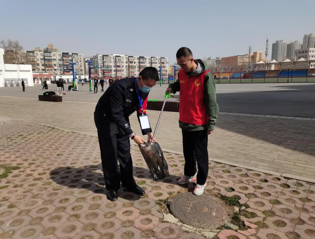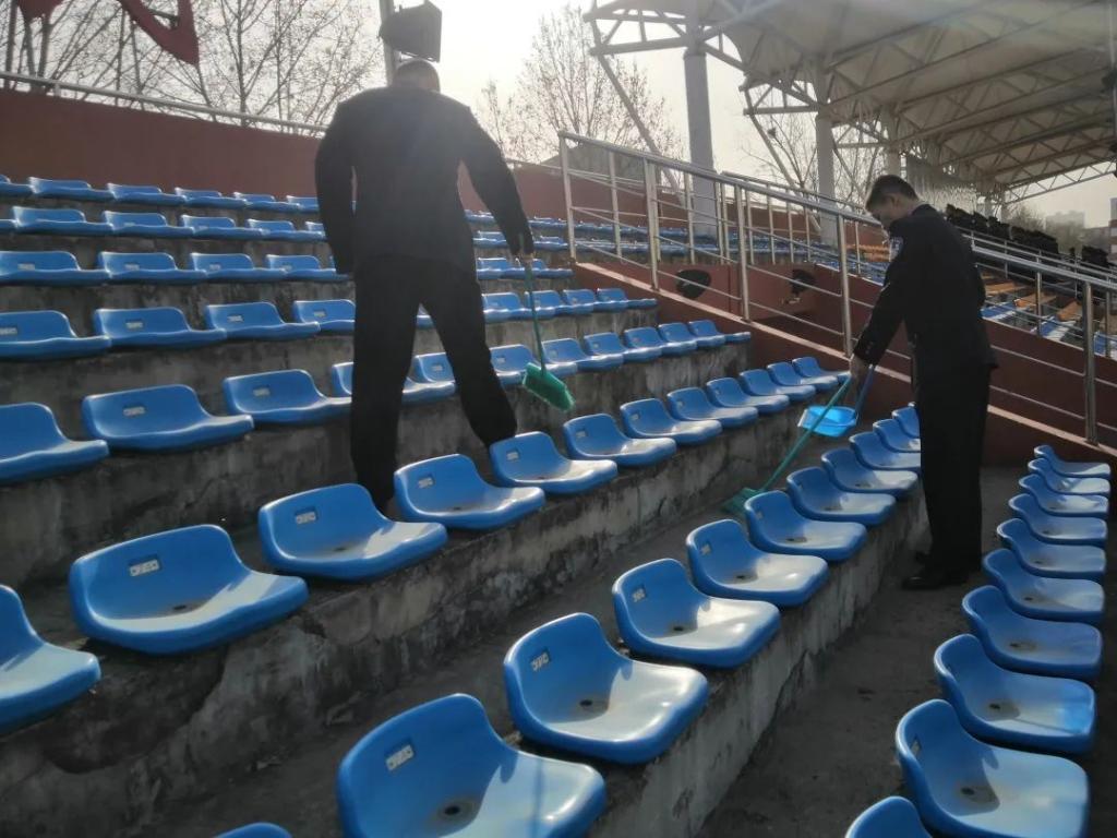 图像网络与侦查系的同学认真地打扫操场卫生,清理座椅周边的垃圾。