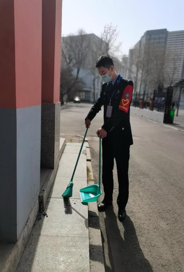 忠诚广场上,公安管理学系的同学拿起扫帚清扫落叶。
