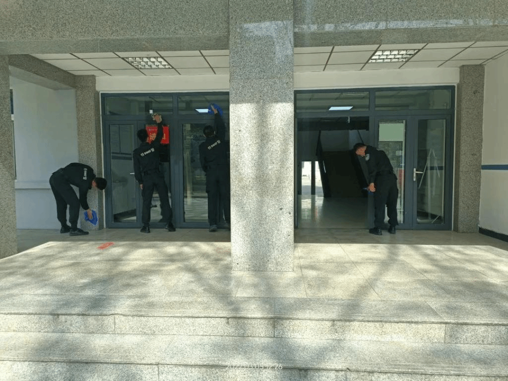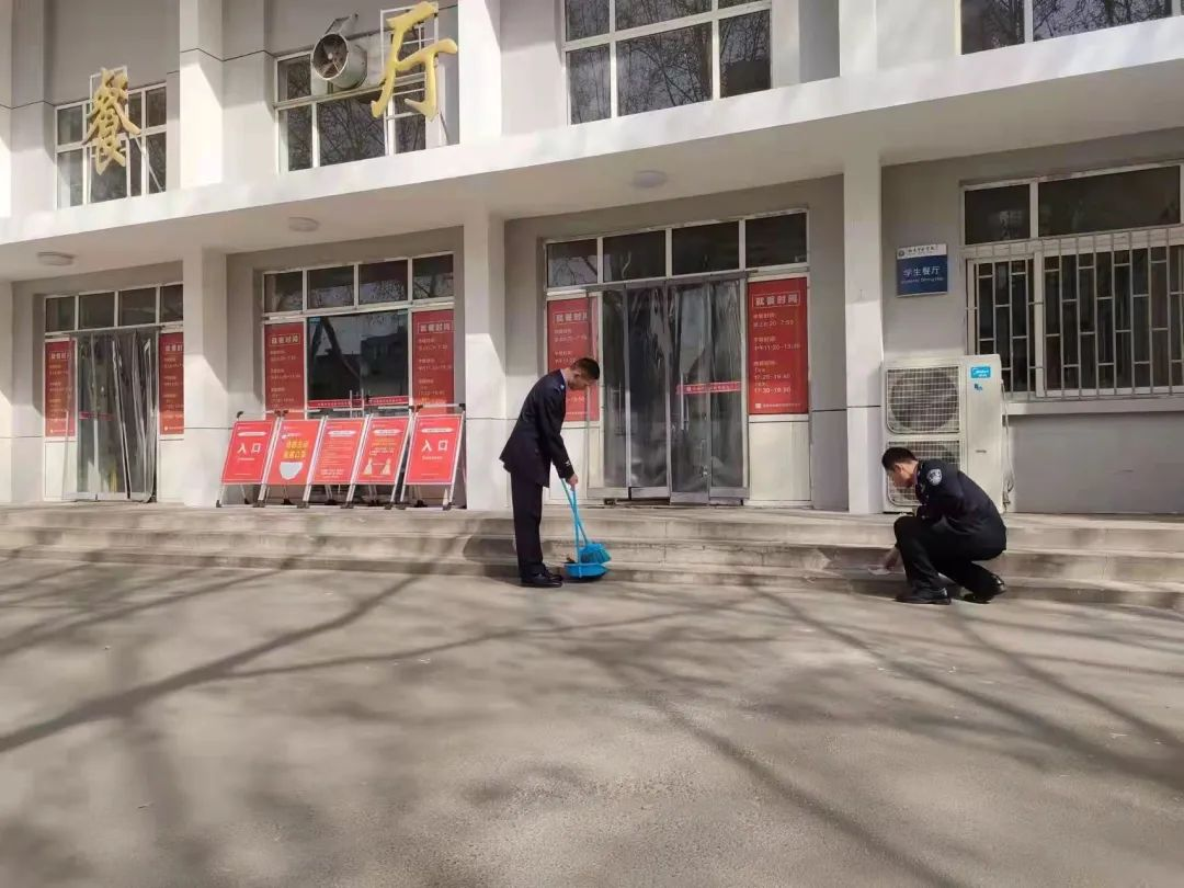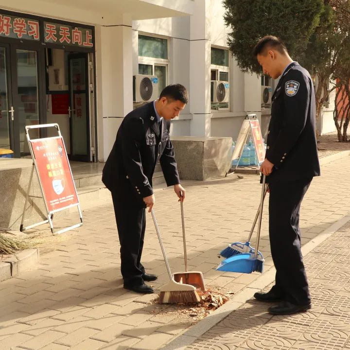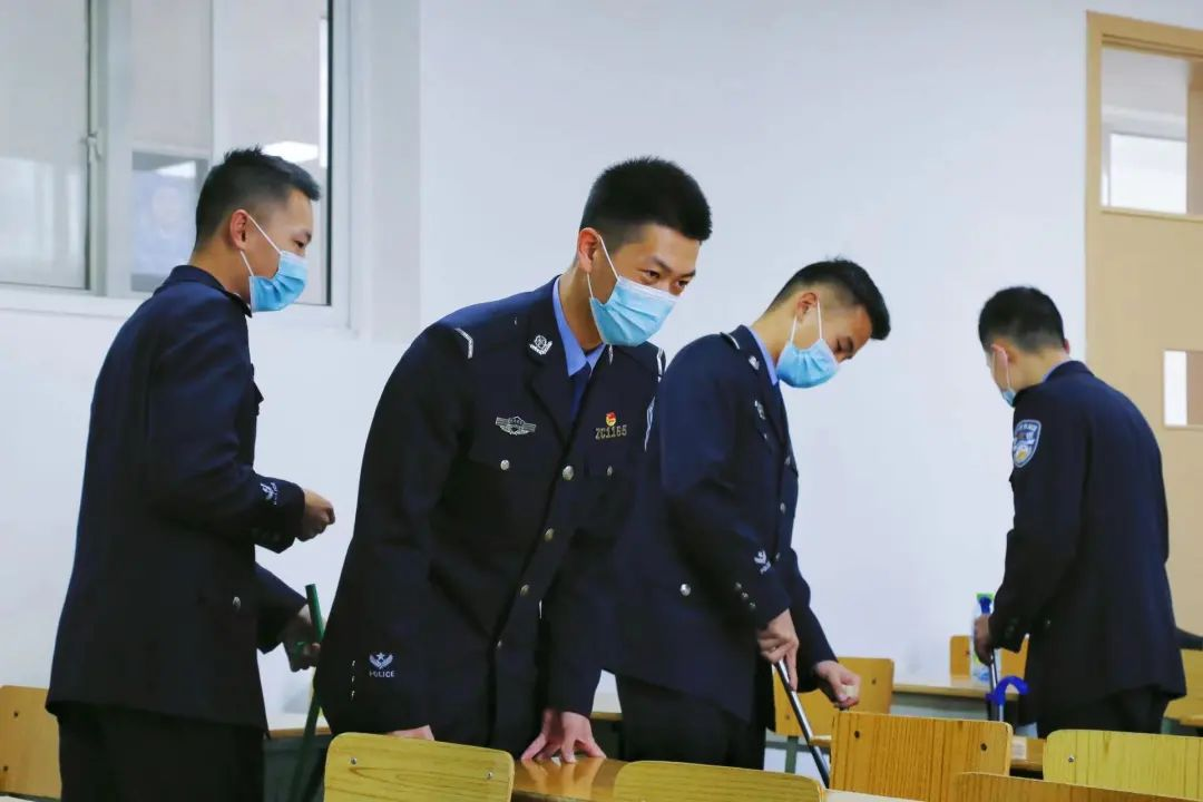 警察体育与战术训练教研部的同学细心地清理草丛的落叶,擦拭宿舍外的墙壁。