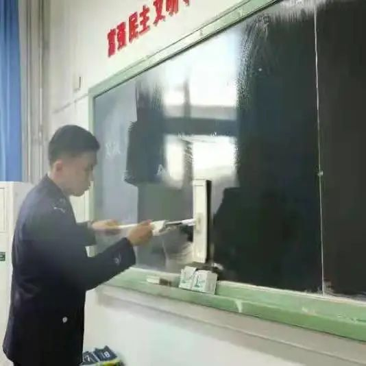 治安学系同学打扫教学楼卫生,擦拭教室桌椅。