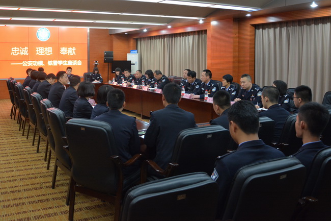 座谈会上,功模们与同学们深入交流,畅所欲言,他们从自身的经历出发,讲述了很多感人至深的事迹,分享了许多基层铁路公安工作经验。面对繁杂沉重的工作,功模曾芝强告诉同学们要摆正自己的位置,坚守责任与执着;面对铁路沿线群众,功模季长山告诉同学们要始终坚持“接近群众鱼得水,脱离群众树断根”的人生信条,踏踏实实为百姓做事,才能得到了人民群众的信任与支持。同时,他要求同学们积极展示自己的才能,学会积累经验,培养人格魅力;尚成书警官回想自己当年面对歹徒,心中没有一丝惧怕,只是一心想着一定要扑倒眼前这个携带炸药的犯罪疯子,他的这种在生死面前无所畏惧的精神深深打动了在场的每一位同学;“铁警霸王花”王雄回答学生提问时说:“从警之后,从不懂到熟悉到喜欢,并不觉得这是一种负担,因为自己把工作当成了事业来做”;同为女警官的侯丽文,不仅仅是警察,也是一名法医,她向同学们讲述说尽管胆小害怕还是义无反顾的走上了这条路,靠的就是能够沉住心,耐住寂寞;对于学生提问的如何攻克工作上遇到的艰难险阻,贾森团警官说了八个字,“学习、甄别、热爱、收获”。八字虽短,却句句在心。面对家庭、工作两者如何平衡的问题,杨光泽警官认为工作与家庭应该区分开来,不要混为一谈,而后要常常与家人沟通,以期获得家人的支持与理解;陈谊警官特别提出,作为一名人民警察,平时的警务技能不可缺少,提升自身的警务能力十分有必要,不忘初心,方得始终。