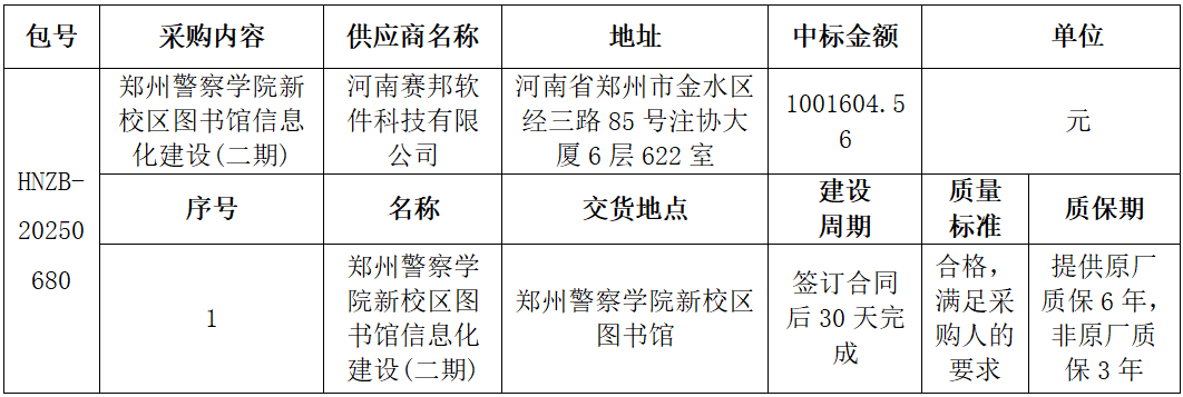 本项目中标公告在《中国政府采购网》、《中国招标投标公共服务平台》、《郑州警察学院校园网》发布。中标公告期限为1个工作日。