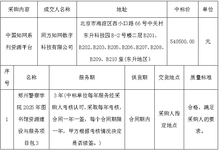 本次成交结果公告在《中国政府采购网》、《中国招标投标公共服务平台》、《郑州警察学院校园网》上发布。成交公告发布之日起1个工作日。