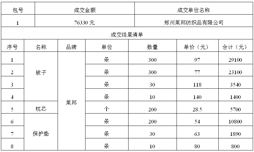 经评审,郑州莱邦纺织品有限公司在满足比价公告全部资格要求的前提下,以最低报价被确定为本项目的中标人。现予公告。