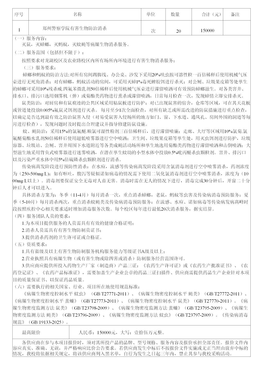 2025年郑州警察学院有害生物防治消杀服务项目