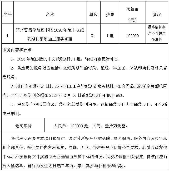 郑州警察学院图书馆2026年度中文期刊采购加工服务项目