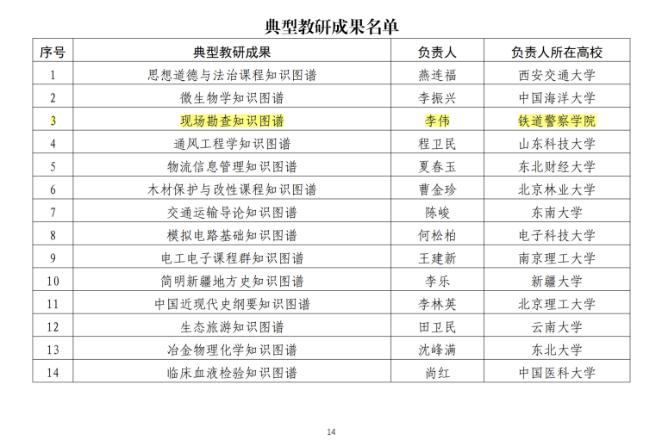 2023年12月12日,教育部虚拟教研室建设专家组发布通知,公布了2023年度国家级虚拟教研室试点建设典型名单,我院国家级“铁路物证技术虚拟教研室”编著的《现场勘查知识图谱》获评“典型教研成果奖”。