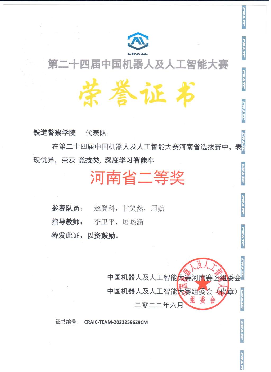 2022年5月22日,第24届中国机器人及人工智能大赛河南省赛在线上和线下同时开赛。本次省赛由中国机器人及人工智能大赛组委会和CAAI机器人文化艺术专业委员会联合主办。全省40余所高校,1785个团队参赛。我院图像与网络侦查系赵登科、甘笑然、周勋团队在深度学习智能车类竞赛中获得省级二等奖,将进入国赛;图像与网络侦查系化政洋、张依可、郑孝泽团队在深度学习智能车类竞赛中获得省级三等奖;图像与网络侦查系刘孟然、侦查学系劳兆盈团队在人工智能创新赛中获得省级二等奖,将进入国赛;公安管理学系董伟涵,图像与网络侦查系贾雪繁、马上团队在人工智能创新赛获得省级三等奖,指导老师团队成员为图像与网络侦查系李卫平、屠晓涵、卢云聪。