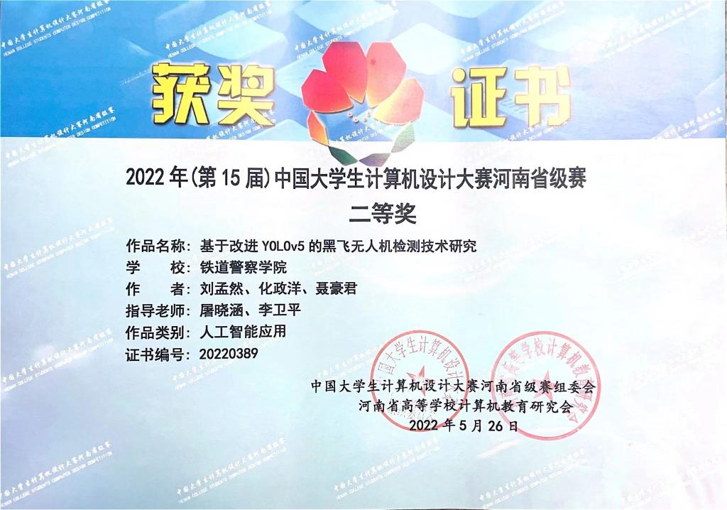 2022年5月21日,第15届中国大学生计算机设计大赛暨 2022 年中国大学生计算机设计大赛“玲珑杯”河南省级赛在线上举行。本次省赛由中国大学生计算机设计大赛河南省级赛组委会和河南省高等学校计算机教育研究会联合主办。全省50余所高校、2000名选手参加了比赛,经过激烈的线上角逐,我院图像与网络侦查系刘孟然、化政洋、聂豪君三名同学的人工智能应用类作品“基于改进YOLOv5的黑飞无人机检测技术研究”获得省赛二等奖并成功晋级国赛决赛;公安管理学系董伟涵,图像与网络侦查系贾雪繁、马上三名同学的物联网应用类作品“疫情下的“电子哨兵”——指纹核验系统设计”获得省赛三等奖,指导老师团队成员为图像与网络侦查系屠晓涵、李卫平、庄海燕。