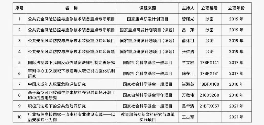 筑牢科研平台,横向合作成果突出。先后组建了“铁路警务研究中心” “城市轨道交通警务研究中心”等19个跨学科研究机构。同时,与公安部交通管理科学研究所建立了“3+3”人才合作培养模式;与公安部第三研究所共建图像与网络侦查系;与杭州海康威视数字技术股份有限公司共建城市轨道交通公共安全技术重点实验室;与郑州大学共建郑州大学公共安全研究院。