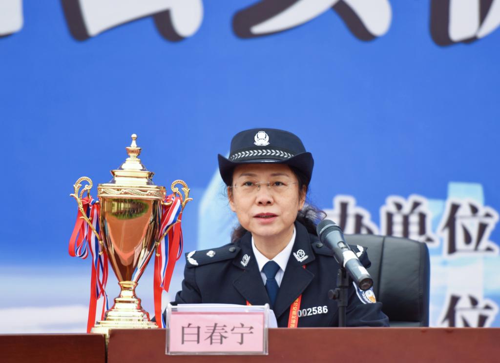 公安部铁路公安局人事训练处一级调研员白春宁宣布团体总成绩。