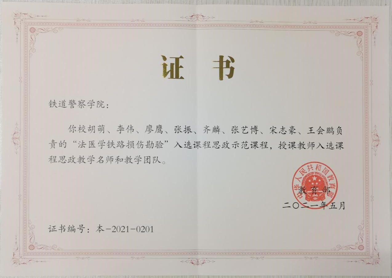 近日,教育部办公厅发布《教育部关于公布课程思政示范项目名单的通知》(教高函〔2021〕7号),我院《法医学铁路损伤勘验》入选首批国家级课程思政示范课程,刑事科学技术系胡萌副教授及其团队获评国家课程思政教学名师和教学团队。