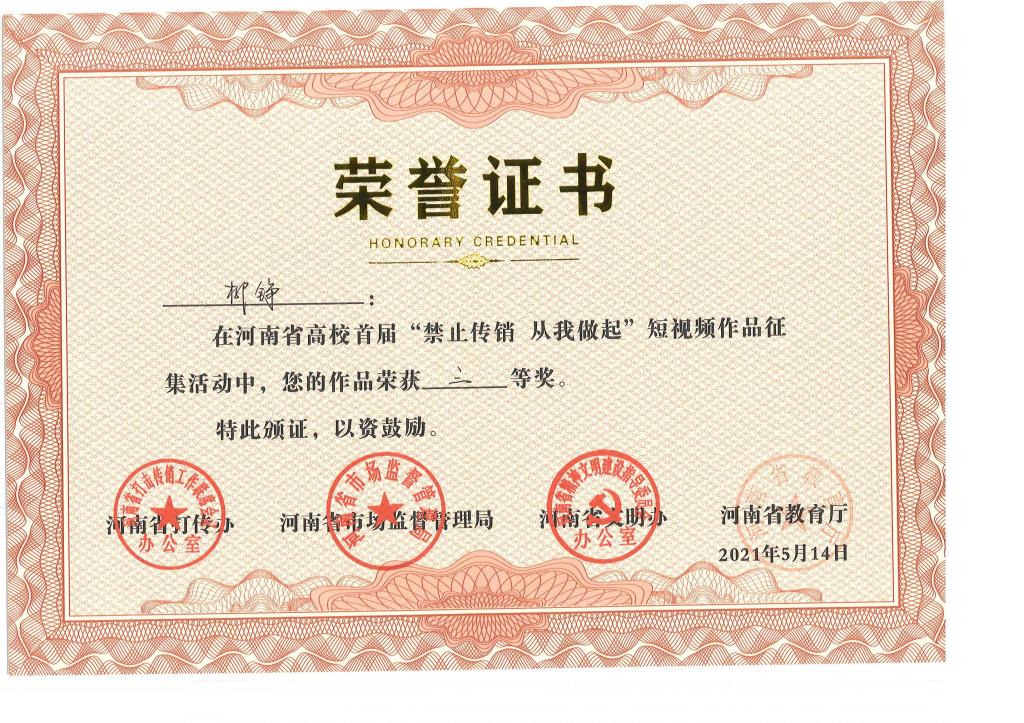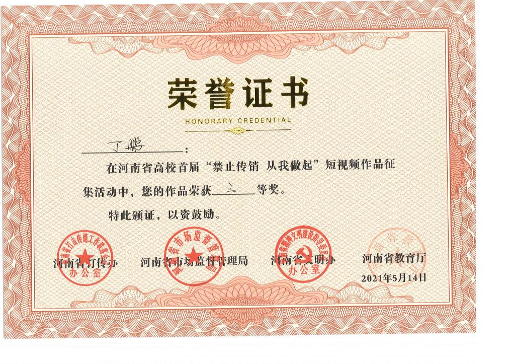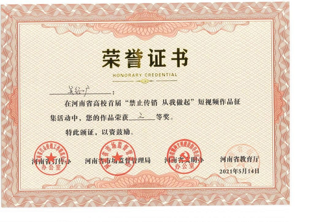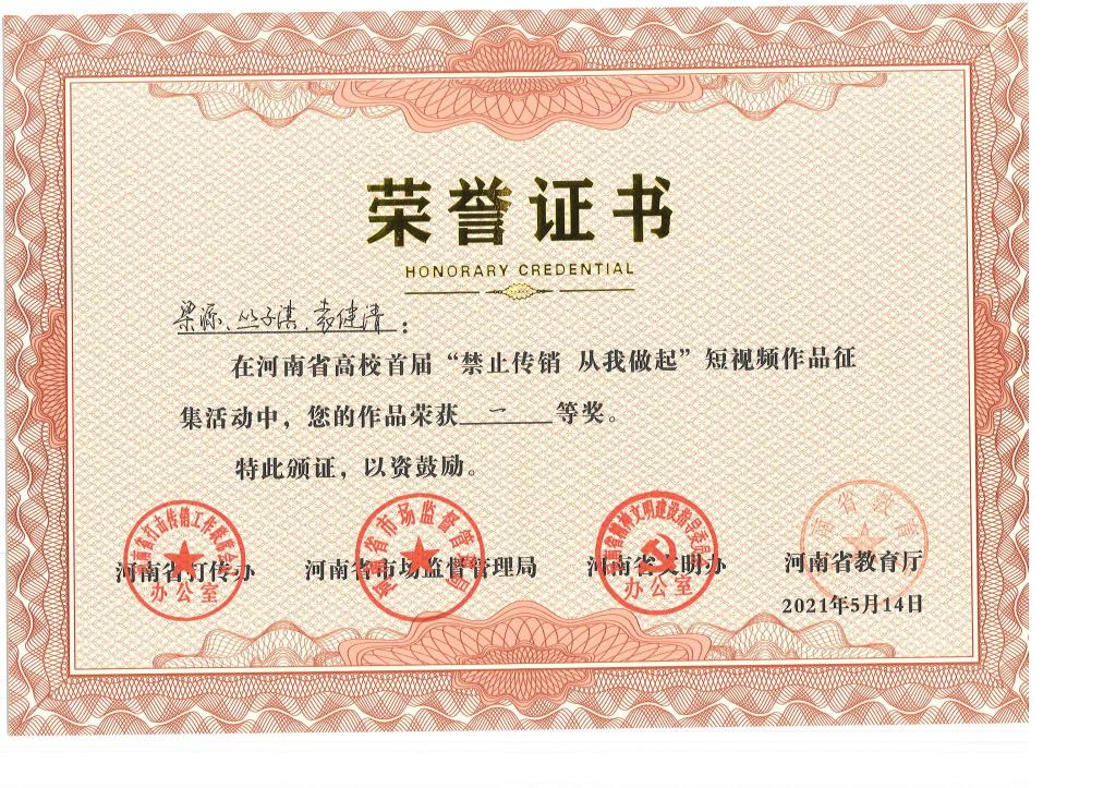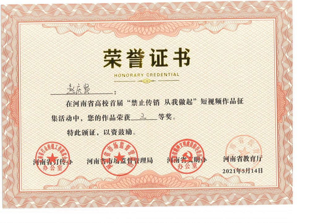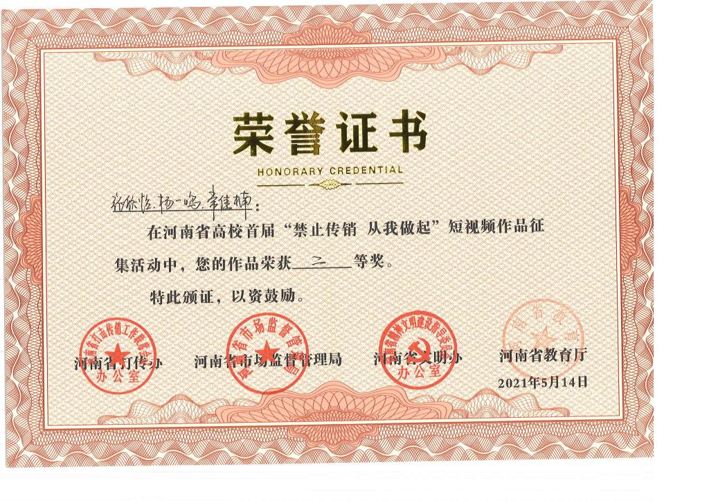 近日,河南省高校首届“禁止传销 从我做起”短视频作品征集评选结果公布,我院报送的5件作品全部获奖,其中《禁止传销(梁源)》获一等奖,《禁止传销》(常佳楠)获二等奖,《禁止传销》(赵庆贤)、《禁止传销》(李岳峰)、《来电》(吴征广)获三等奖。