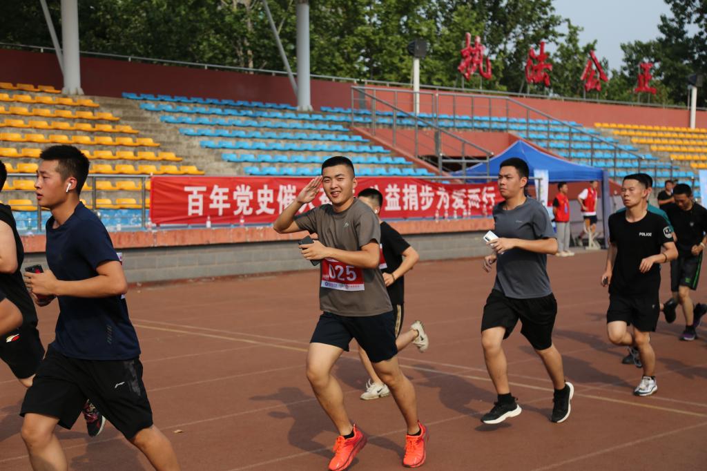 1公里健步走结束后,300名参加7.1公里慢步跑的学生在操场集合,开赛前20分钟,工作人员为同学们作赛前注意事项讲解,并组织进行热身运动。随后,警察体育与战术训练教研部老师为本次“百年新征程,捐步为战友”迎接建党100周年主题跑发号施令,伴随着清脆的发令枪声,同学们冲出起跑线,7.1公里慢步跑启程。经过一小时的爱心奔跑,我院学生捐献约600万步。
