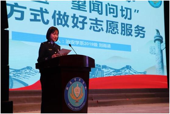 治安学系2019级的刘雨涵以《用中医“望闻问切”的方式做好志愿服务》为题,讲述了她在河南省郑州市志愿社区中,抱着必胜之心知重负重、攻坚克难的服务经历,展现出铁警学子巾帼不让须眉的飒爽英姿。