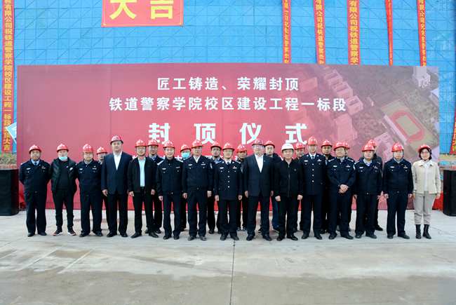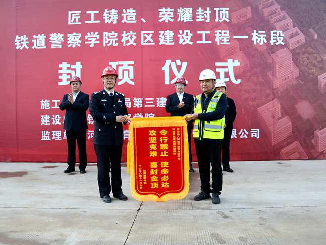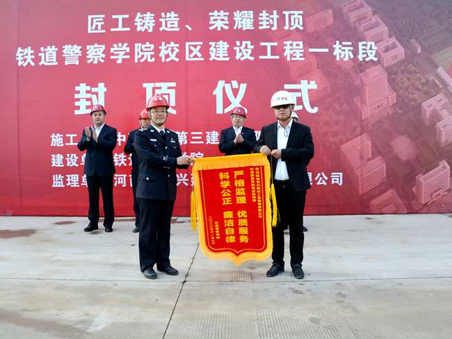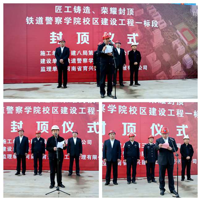 党委副书记、院长、校区建设领导小组组长管曙光出席了本次封顶仪式,他代表学院分别向施工单位和监理单位授旗,同时表示诚挚的祝贺和感谢并与参加仪式的代表合影留念。中建八局助理总经理杨爱来,河南省育兴建设工程管理有限公司副经理王瑞波在仪式上发言讲话。