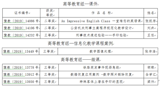 河南省教育厅近日下发《关于公布第二十三届全国教师教育教学信息化交流活动暨河南省第五届信息技术与课程融合优质课大赛评选结果的通知》(教电教〔2019〕488号),我院共7项作品获奖,其中刘卉《公安机关刑事立案程序规范化教学设计》和张凯存《An Impressive English Class一堂难忘的英语课》荣获二等奖;王任、张传浩、胡萌、谷学汇、梁帅5位老师的作品荣获三等奖。详见如下: