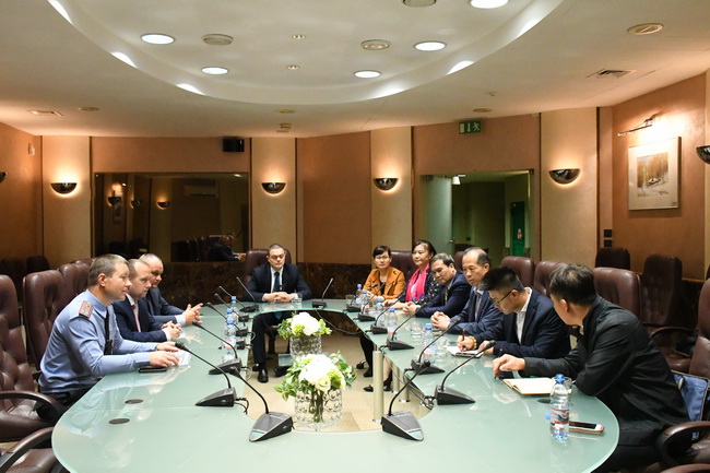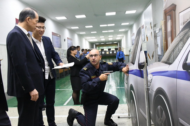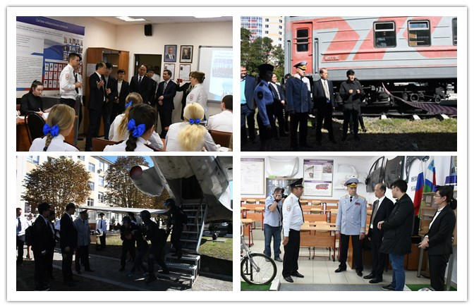 代表团在院长阿梅尔恰科夫少将、常务副院长德米特拉科夫上校、学科副院长奥泽罗夫上校、学院教学办公室主任亚历山大罗夫中校、学院内务办公室主任福罗夫少校陪同下,先后参观了校史馆、爱国教育中心、法律系学员宿舍、心理疏导室、中心控制室、空中交通教研室、海洋交通教研室、多功能实验教学楼(包括汽车犯罪、刑事技术、铁路运输、金融犯罪、法医、输油输气管道犯罪、武器弹药、毒品犯罪等实验实训室。在航空和铁路实训场,学员们先后展示了在雅科夫列夫40飞机和铁路客运列车车厢狭窄空间抓捕术、警犬查毒缉捕术。最后,在运动场举行了大型警务技能汇演,展示学员们严整的警容风纪、过硬的身体素质、娴熟的警务技能和充满朝气、阳光的精神风貌。