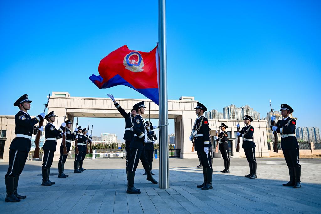 “升中国人民警察警旗、奏唱中国人民警察警歌!”上午9点30分,仪仗队步伐整齐划一,身姿挺拔矫健,眼神中透露出坚定与自豪,迈着整齐有力的正步,护卫着鲜艳的警旗迈向升旗台。伴随着《中国人民警察警歌》的激昂旋律,警旗在微风中缓缓升起,与初升的太阳交相辉映。全体人员神情庄重,向警旗致以最崇高的敬礼。