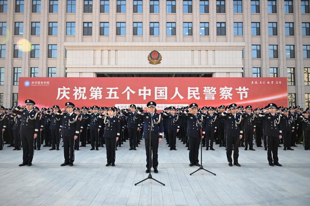 随后,在学院党委书记白少强的带领下,大家面向警旗,举起右拳庄严宣誓,重温人民警察誓词。坚定有力的誓词声在校园上空回荡,彰显着全体师生对公安事业的无限忠诚和为人民服务的坚定决心。