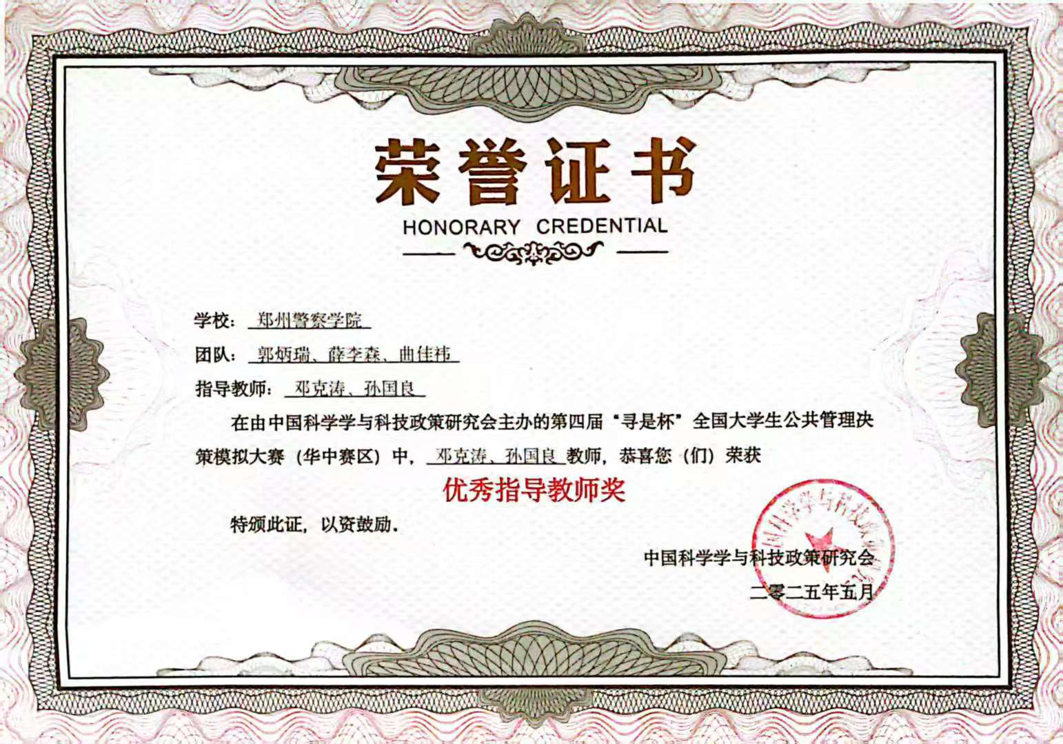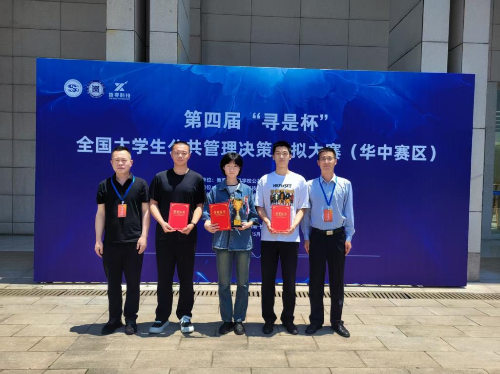 2025年5月10日至11日,第四届“寻是杯”全国大学生公共管理决策模拟大赛(华中赛区)在中南大学举行,来自河南、湖北、湖南和江西四省的55支高校代表队参与比赛。经过激烈的角逐,我校由公安管理学院2022级学生郭炳瑞、2023级学生薛李森和2024级学生曲佳祎组成的代表队,在教师邓克涛、孙国良的精心指导下,凭借扎实的专业素养和出色的团队协作荣获大赛二等奖。