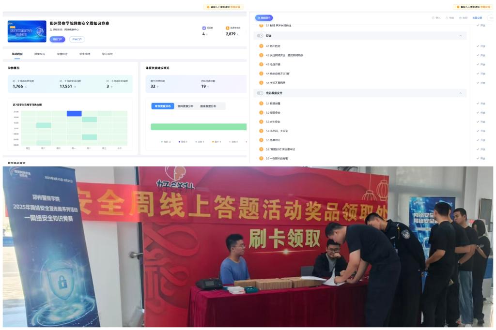 本次活动还搭建《郑州警察学院网络安全周知识竞赛》的线上特色课程平台,上线网络安全相关的科普视频32个、竞赛题库649题,内容涵盖网络涉密行为规范、风险识别、个人信息保护、校园反诈等实用知识,充分满足师生利用碎片化时间自主学习的需求。9月19日至20日依托本课程完成了网络安全知识线上竞赛活动,活动参与人数达2879人,共有1439人取得了有效成绩,205人获得竞赛奖品。