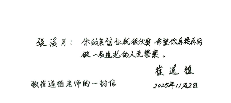 三年淬炼,初心如磐。如今,张溪月以预备警官的身份,再次提笔向崔老道一声惦念。她在信中写道: