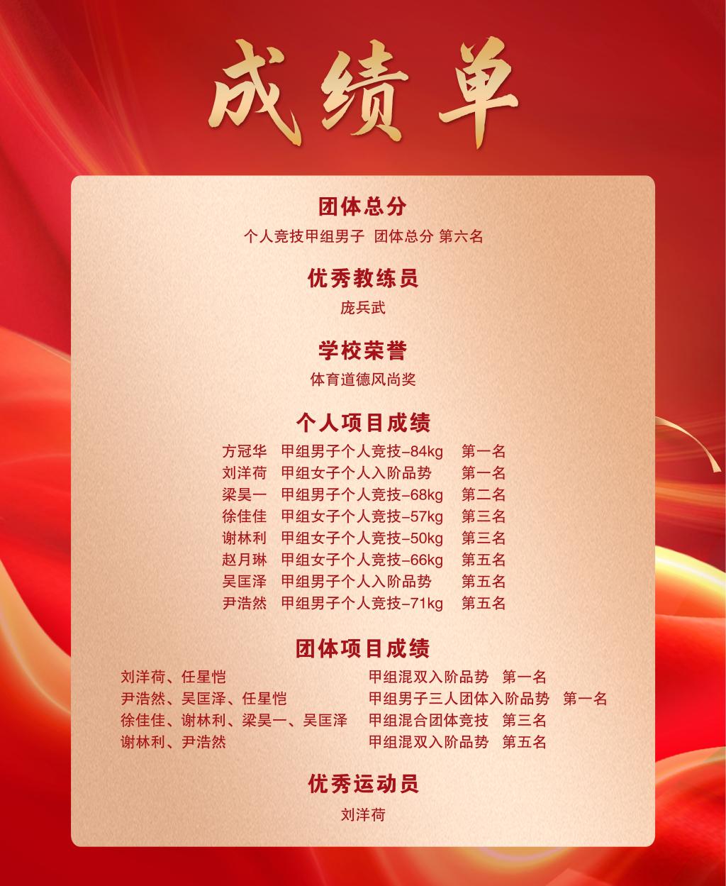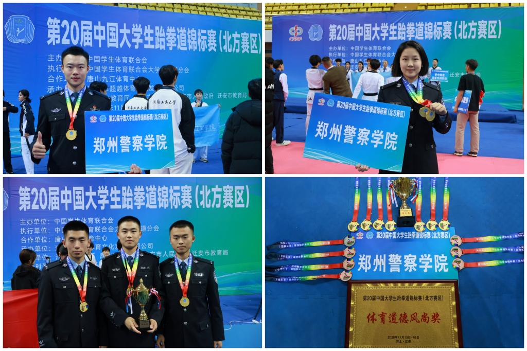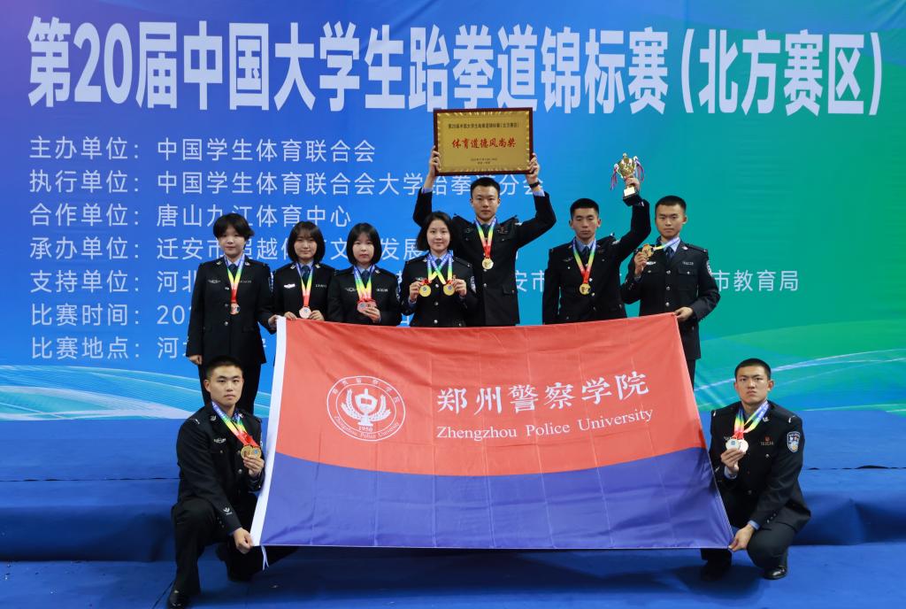 经学校批准,我校跆拳道代表队共选派9名队员参赛。在为期七天的激烈角逐中,我校跆拳道代表队共斩获4金、1银、3铜,并取得4个第五名的好成绩,团体总分位列全国第六,荣获“体育道德风尚奖”。此外,刑事科学技术学院2023级一中队刘洋荷同学因出色的赛场表现和良好的体育风貌,被授予“优秀运动员”荣誉称号。
