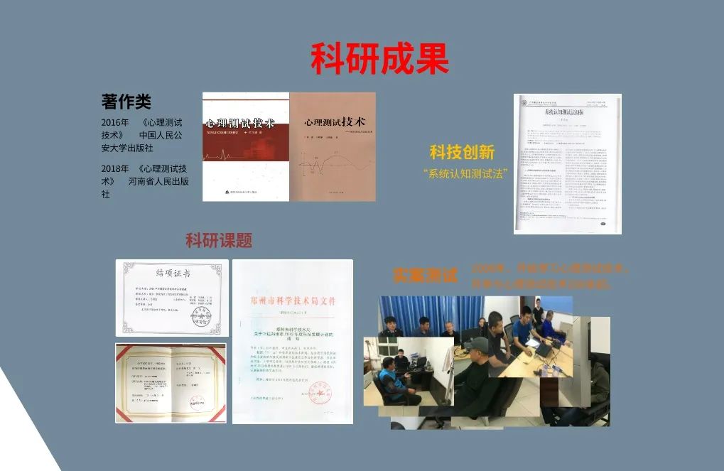 在多年的探索下,王功建师兄在测谎上颇有建树,他与同事们共同总结出了具有铁路公安特色的“侦—测—审一体化”工作模式,该模式意在理顺三者之间的关系,减少使用中的冲突,推进科学运用,提高运用效果,而并非是死板捆绑于一体使用。同时,王功建师兄出版了多本专业书籍,完成多个科研课题,这些成果都在案件的侦破中取得奇效。