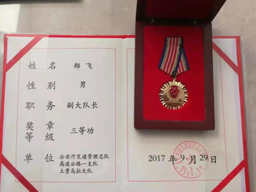 郑飞,男,48岁,内蒙古乌兰察布人,中共党员,郑州铁路警察学校(现铁道警察学院)1994级中专三队治安学毕业生,在校期间曾担任区队团支部书记,毕业后工作于内蒙古集通铁路白旗分局白旗站派出所,曾荣立三等功一次,多次被评为呼和浩特铁路公安局先进个人。他从车站民警做起,先后任警长、法制科科长、派出所所长,2011年调任内蒙古公安厅交警总队高速公路支队,现任副大队长。