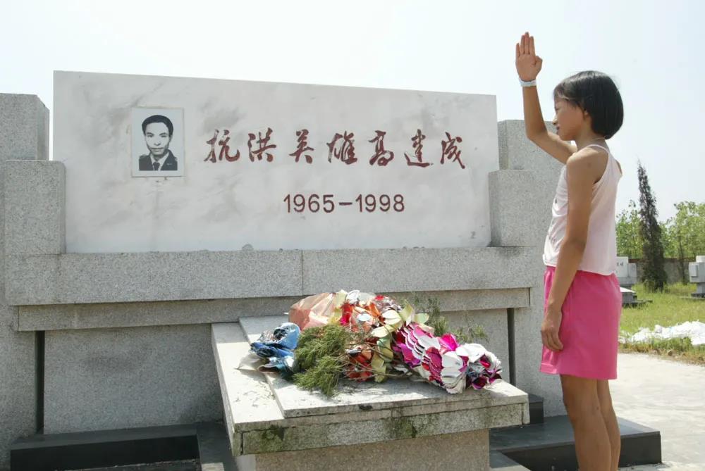 2002年8月29日,11岁的江珊向设立在湖北省嘉鱼县簰洲湾民垸中堡村村边的“抗洪英雄高建成”烈士墓致敬。新华社记者查春明摄
