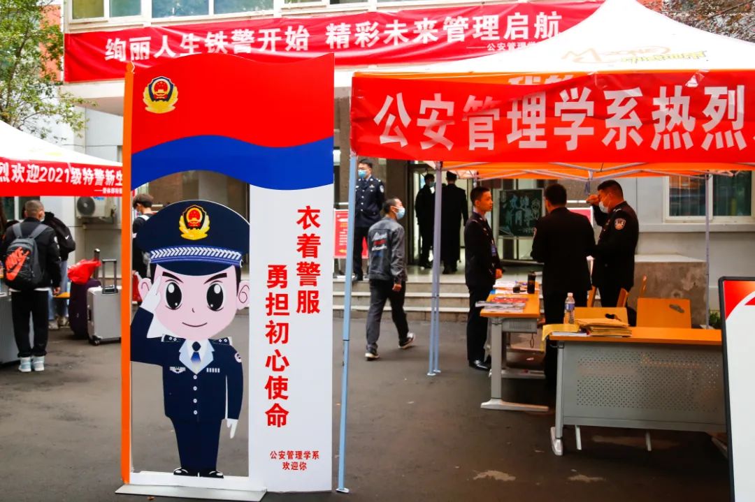 公安管理学系报到现场,别具特色的两个“铁小警”笔直地站立在公寓楼前。“衣着警服,勇担初心使命;握笔提书,共写藏蓝青春。”这是公安管理学系对新生的祝福,更是对刚刚加入铁警大家庭的师弟师妹们的期许和认可。相信2021级的管理学子的梦想定能在铁警如愿以偿,成为他们心中那个优秀的自己!